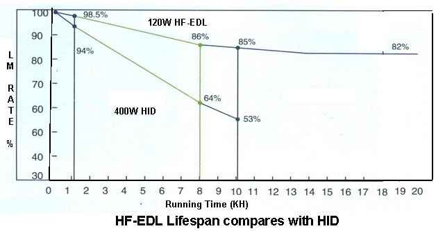 plasma. 1. Long lifespan – ≥60,000 hours 2. Short start and restart time – <0.5 seconds 3. High power factor – ≥0.98 4. Low surface temperature – <90ºC 5. High Stability – Flicker free 6. Wide voltage range – 125-265V 7. High Ra – >80 8. Low maintenance fee – Mostly free maintenance in first 3 years 2.2 Advantage – Lifespan compares with HID:-
