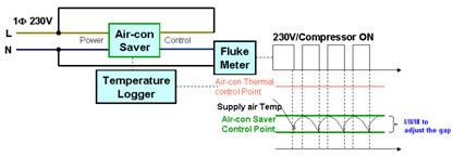 Air-con Saver applies fuzzy-logical technology to simulate human being’s sense of temperature and enhance the refrigeration efficiency by optimizing the operation curve of compressor, as well as to control compressor to adjust cool air output and prevent the air over-cooled from over-using energy, and further to save the over-used energy. It's carried out as follows:-