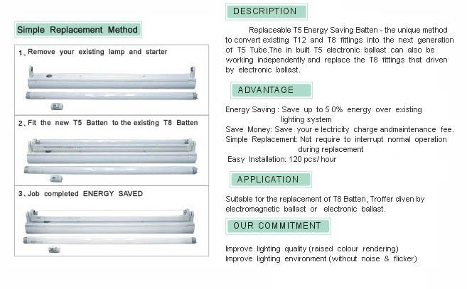 In some instances replacing old equipment with newer, more energy efficient equipment is warranted. In many cases, local utilities will offer rebates for such upgrades and the energy savings can be dramatic. For example, inefficient older T-12 and T8 fluorescent lamps with electro-magnetic (EM) ballasts are replaced by more modern electronic ballasts with T-8 or T-5 lamps; HID, HPSL & HPM can be replaced with high efficiency lamp, such as HF-EDL. This treatment alone can cut the electric bill for the lights by 30% - 65%! 1. T5 adaptor for T8 fluorescent tube => Details T5 adaptor applies advanced T5 technology to retrofit T8 fluorescent tube in simple way. If you are concerned for the retrofitting cost, we recommend you to replace the T8 fluorescent light with the T5 adaptor. This treatment alone can cut the electric bill for the lights by 25% to 45%! 1.1 T5 adaptor Test Result => Details